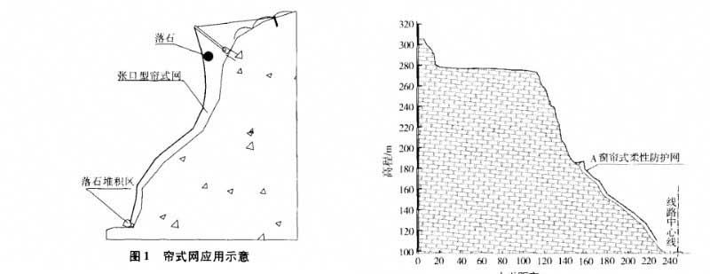 窗簾式柔性防護網(wǎng)采用“引導”的理念控制歐式,即通過柔性防護網(wǎng)與山體間的夾縫對落石進行引導和約束。讓落石按照規(guī)定好的線路滾落到指定的落石堆積區(qū)。