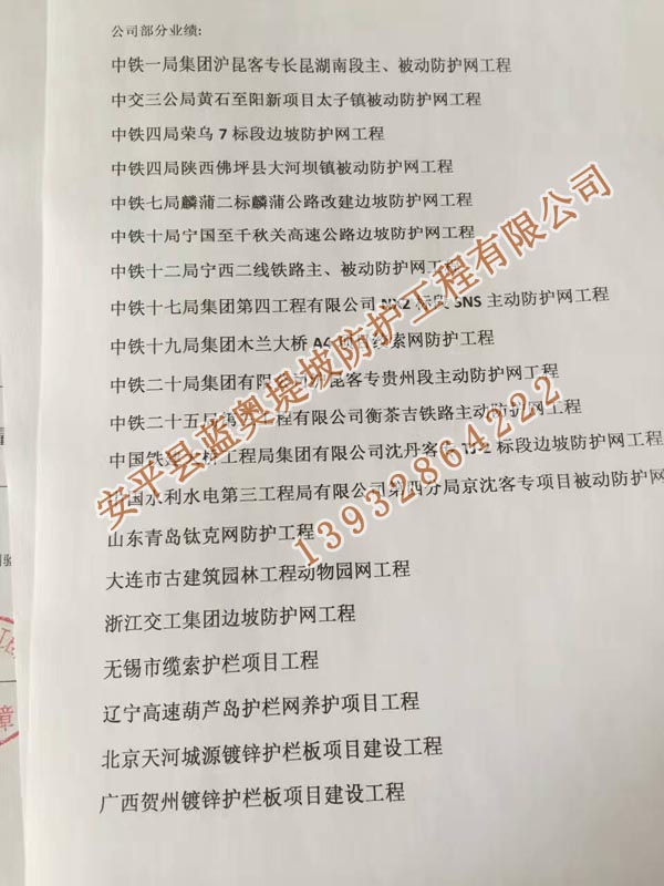 全部各地的客戶朋友們打進(jìn)電話會(huì)咨詢一下邊坡防護(hù)網(wǎng)產(chǎn)品的問題,產(chǎn)品了解清楚后有的朋友會(huì)考察一下公司情況。這樣的客戶朋友我們是非常尊重的,了解供貨方公司實(shí)力這是最自己負(fù)責(zé)對(duì)工程負(fù)責(zé)。因此我們會(huì)提供我公司的相關(guān)資質(zhì)、產(chǎn)品質(zhì)量檢測(cè)報(bào)告、進(jìn)場(chǎng)施工證明等。其實(shí)可以通過公司的工程業(yè)績(jī)(承接的工程項(xiàng)目)來證明公司實(shí)力。有些客戶會(huì)來我公司考察,為了客戶更方便的了解我們之前做過的一些項(xiàng)目,我們將最近3年施工過的邊坡防護(hù)網(wǎng)工程業(yè)績(jī)做了一下統(tǒng)計(jì),并打印出來。